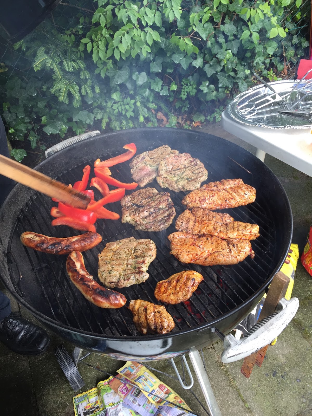 ソーセージやポークをグリルし、プレートにのせていただきます。
