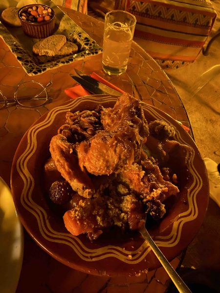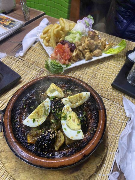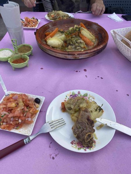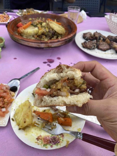僕達は羊肉のタジンに、羊肉のBBQそしてモロッコサラダを注文した。 モロッコサラダは味付けは塩胡椒で具材にはトマトに玉ねぎ、パクチーそしてオリーブを添えたシンプルな物だが、これが抜群に美味しくモロッコ滞在中はこのモロッコサラダを終始食べていた。モロッコは生野菜をあまり食べる文化がないようで野菜補充にもうってつけであった。 そしてモロッコで料理を注文すると、必ず「ホブス」と言われる円盤上のパンがついてくるのだが、昔給食で食べたコッペパンとフランスパンが合わさった味がしていてとっても美味しい。