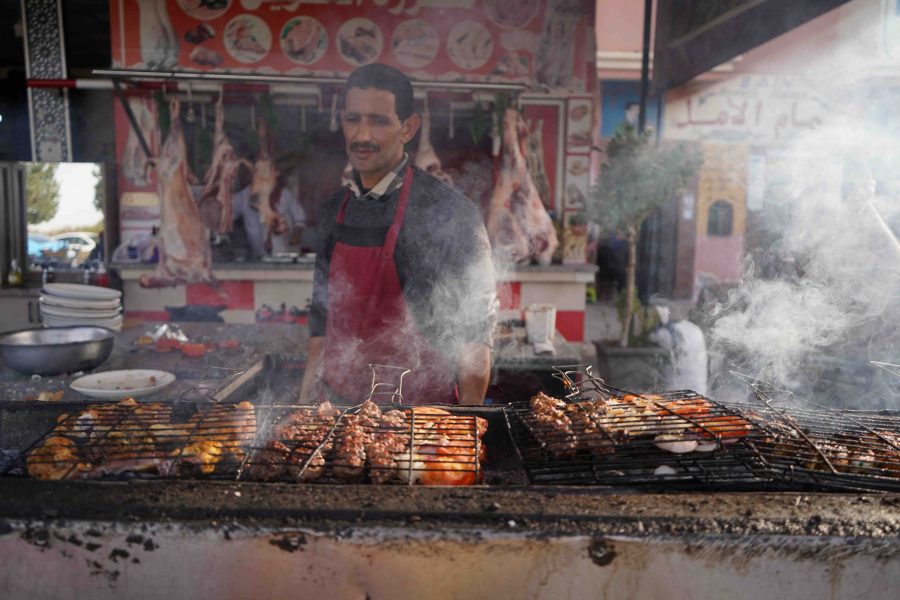モロッコのレストランやバーベキューを提供しているところは肉屋と併設しているところが多い。 この店も同様にBBQの後には解体された羊がぶら下がっている。 そこで肉を購入して焼いてもらうスタイルのようである。