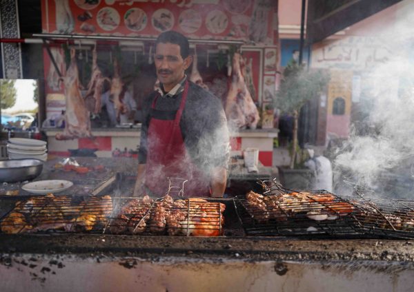 モロッコのレストランやバーベキューを提供しているところは肉屋と併設しているところが多い。 この店も同様にBBQの後には解体された羊がぶら下がっている。 そこで肉を購入して焼いてもらうスタイルのようである。