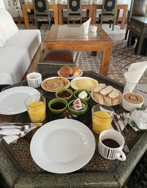 朝食はモロッコのパン(ホブズをカットしたもの、クロワッサン、穴が開いたスポンジのようなバグリール、)に チーズ、はちみつ、ジャム、 コーヒー オレンジジュース ヨーグルトだった。