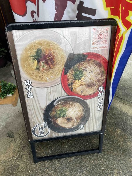 店舗前には「ゆず塩ラーメン」「焦がしみそラーメン」「黒ラーメン」のPOPが置かれています。