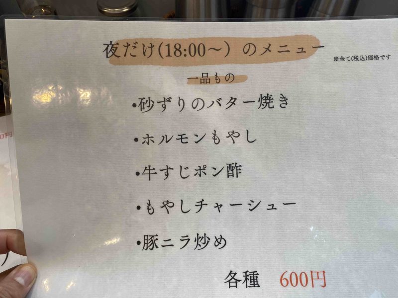 夜だけのメニューには一杯飲めるメニューも揃っています。