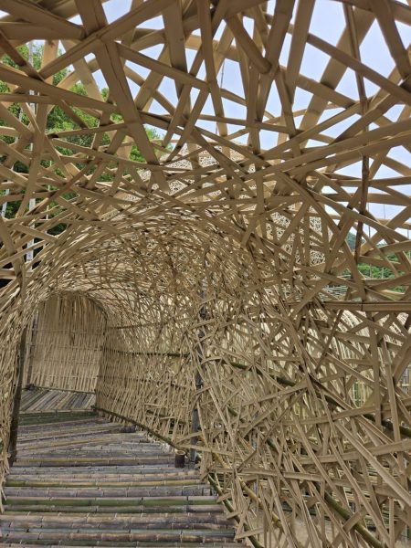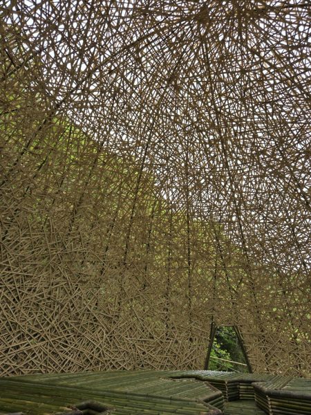 完全看不見任何捆綁或埋釘的痕跡,每一片竹子都像卡在剛剛好的位置上形成巨大球體,進入內部,伴隨著周圍的蟲鳴鳥叫、縫隙穿透進來的光影,好像真正被小豆島給擁抱了。