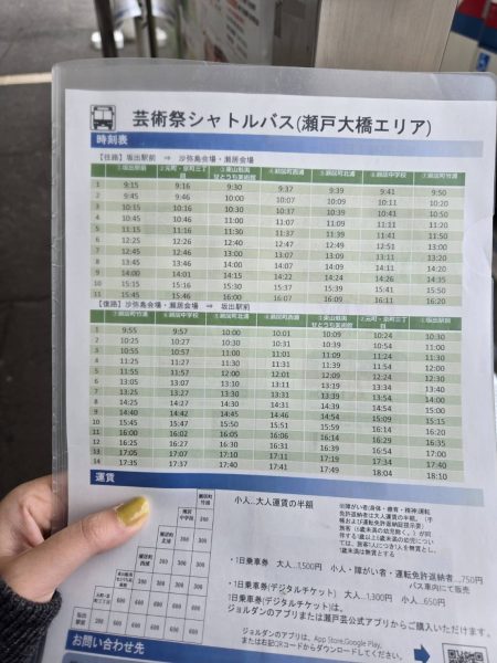 除了平時的常態公車,還有藝術祭期間加開的車次,若是想要將沙彌島與瀬居島一次走完的話,推薦可以在瀨戶內官方app上購買瀬戶大橋area的一日乘車券會比較划算。