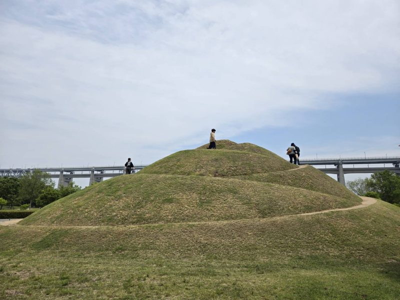 在「沙彌島萬葉會館」站下車後,印入眼簾馬上便是第一個開放作品–「階層・地層・層」,由花崗岩土所堆積塑型而成的小山丘,設計出的緩坡走道隨著作品的形體層層環繞向上,實際走起來完全不耗費體力,而我覺得比起在至高點鳥瞰周邊風景,更有趣的欣賞方式是在底下看著人們圍繞著山丘往上,時而出現時而消失的規律性非常有趣,彷彿在看螞蟻攀爬蟻丘一般,莫名療癒!
