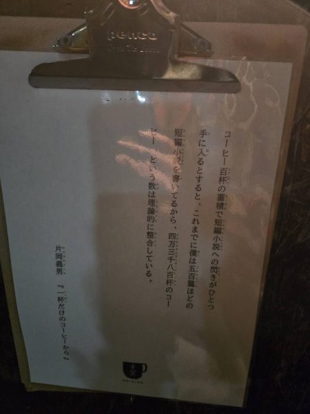 它隱身在小巷內的二樓,一不小心可能會錯過,但它的隱密性也提供了與世隔絕的靜謐感。 從門口放著片岡義勇的作品「一杯だけのコーヒーから」節錄,彷彿已經預告了這家店的風格,每次進到店內就有一種掉入時空隧道的感覺。