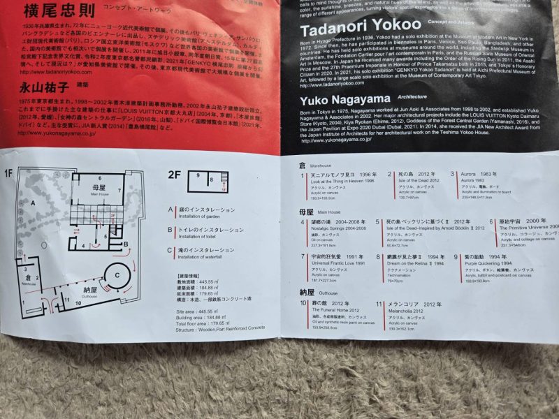 BTW,館方也有推出夜間導覽活動「夜の横尾館」,能在閉館後進場欣賞庭園在夜色中的變化:紅色塔與畫面倒映、玻璃反射畫作、燈光柔和映照紅色空間等等,據說體驗會與白天的感受完全不同 !若時間允許也推薦把夜間行程排進藝術祭期間!