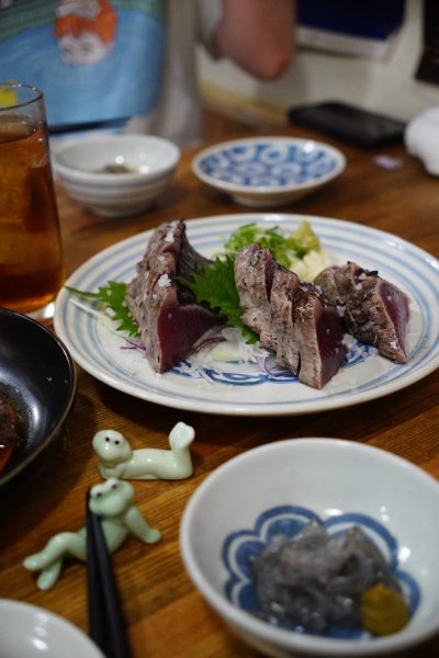 其中一定大推的是這裡的鰹魚料理,尤其是高知的門面「鰹のたたき」,店家直接用松葉燃燒,皮烤到焦脆、帶著松木香氣,然後切成厚片入口,皮脆內軟又多汁。